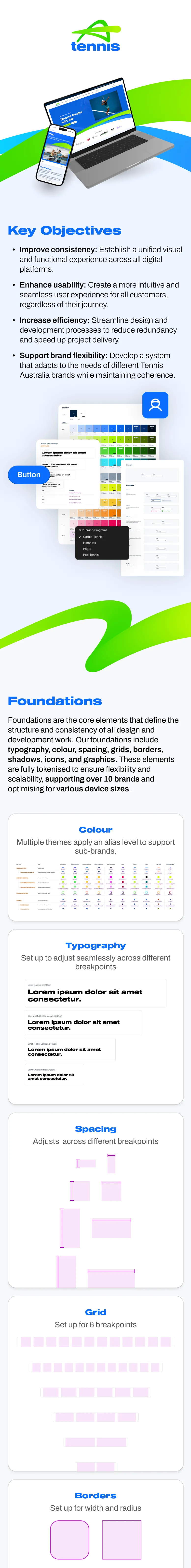 To address this, a flexible design system was created, with comprehensive base tokens, components, and CMS templates that can be applied across all Tennis Australia brands. This approach was taken to unify the sites visually but also to create a better user experiences that caters to their diverse audience and operations.